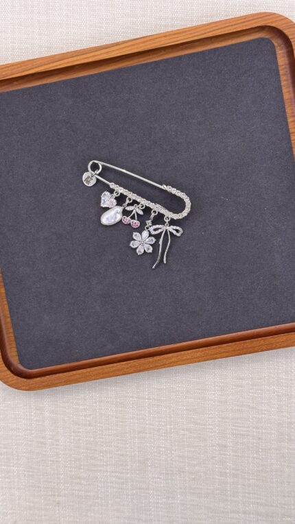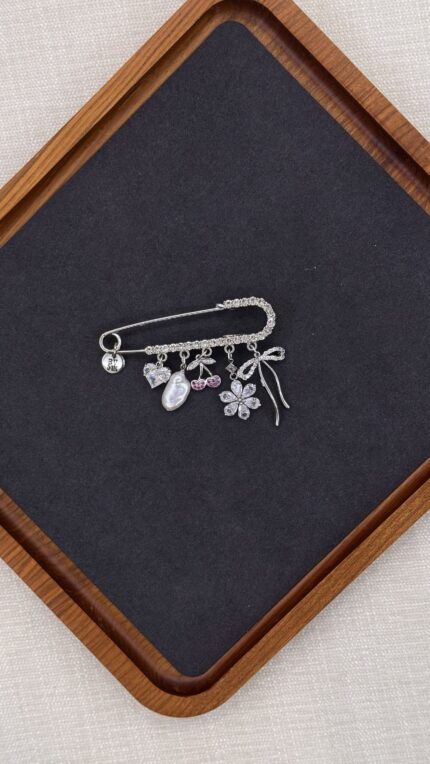 دبوس بتصميم كلاسيكي فاخر مرصّع بحبات الزركون البراقة، مرفق مع شارم مطلي ذهب عيار 18k ليضيف لمعة مميزة وفخامة استثنائية.