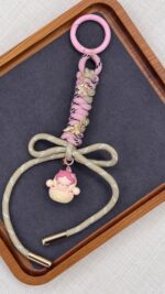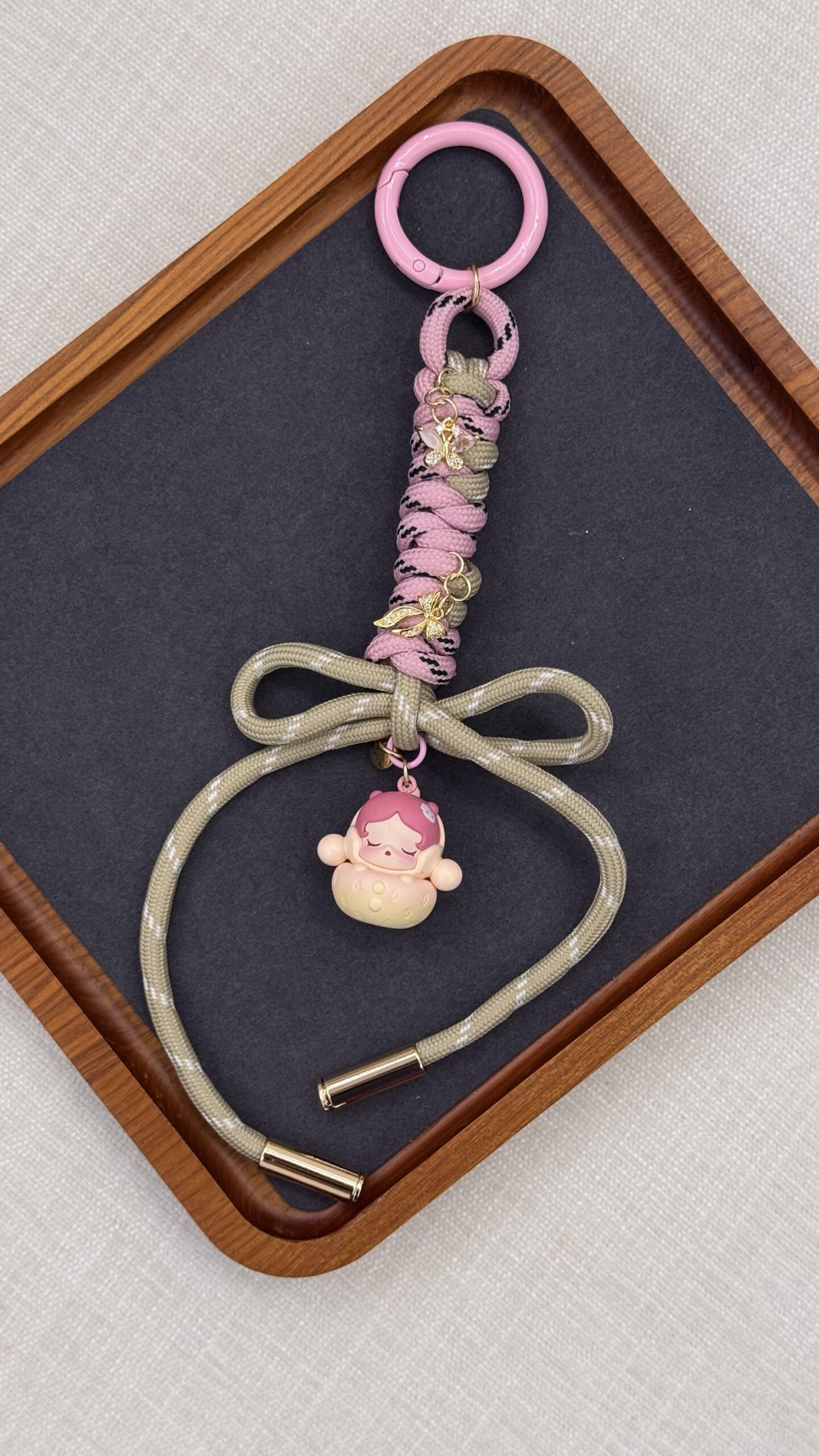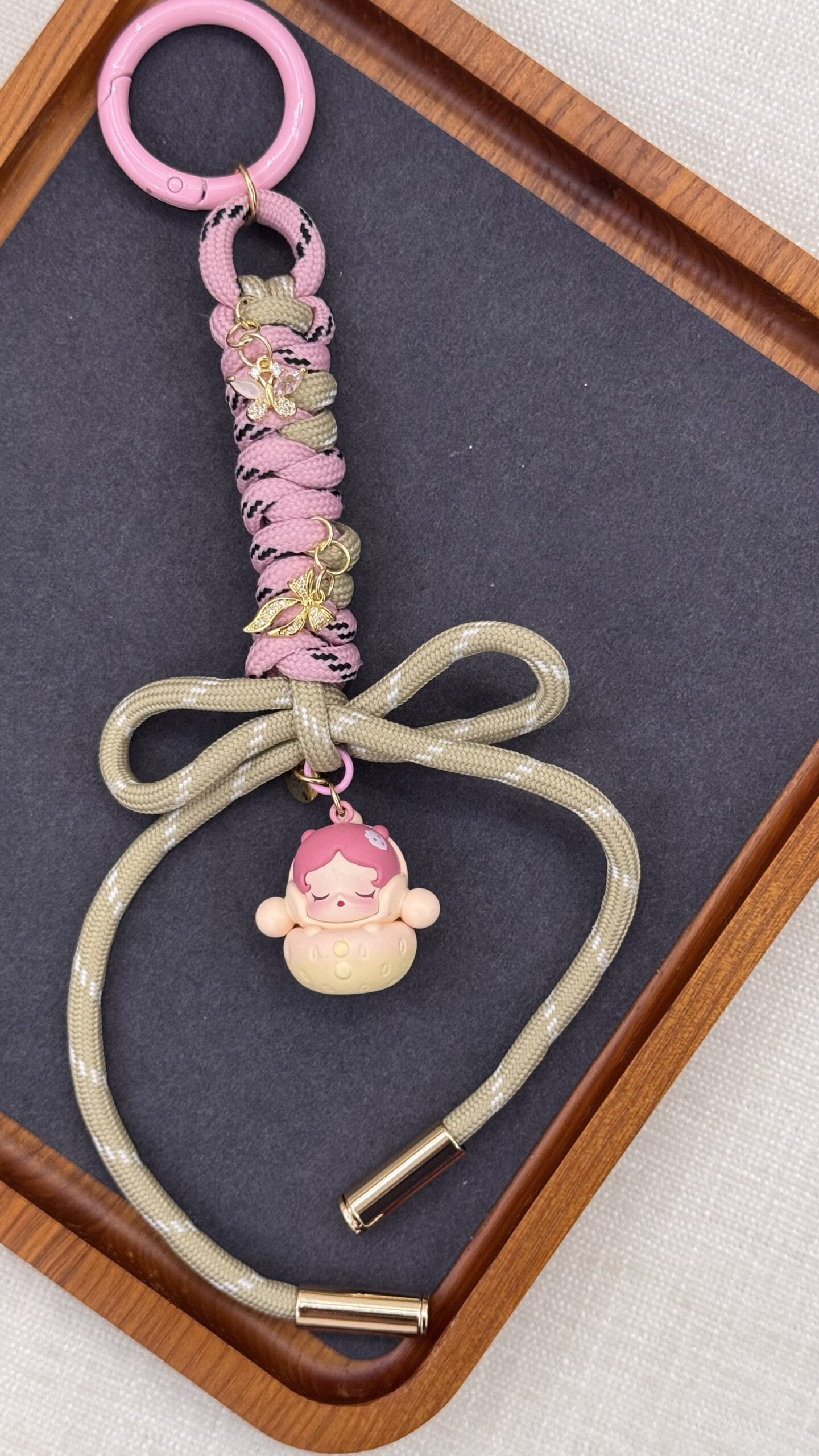 A handmade bag charm crafted from high-quality woven cords and adorned with elegant decorative accents. It features an original Pop Mart figure for an extra cute and unique touch.