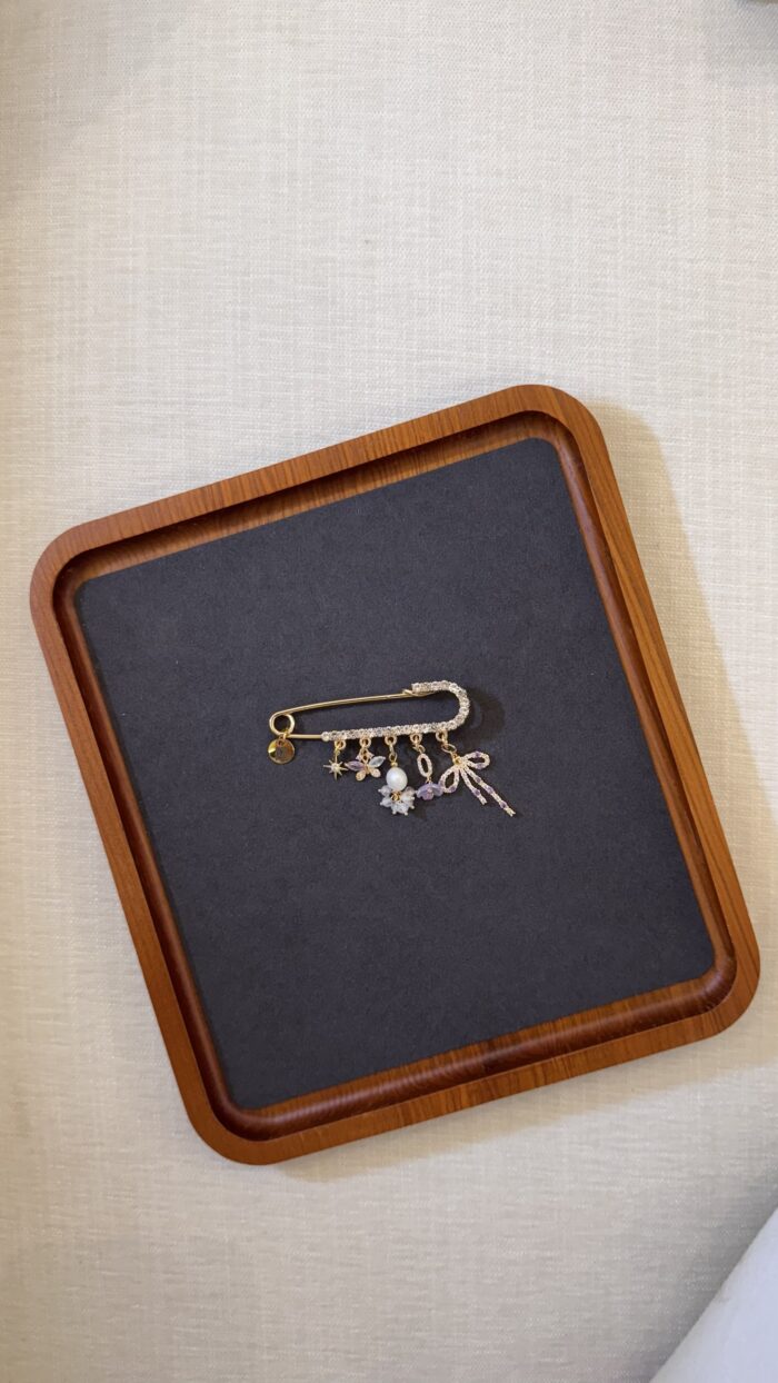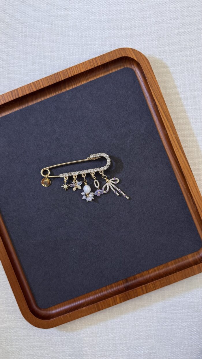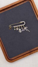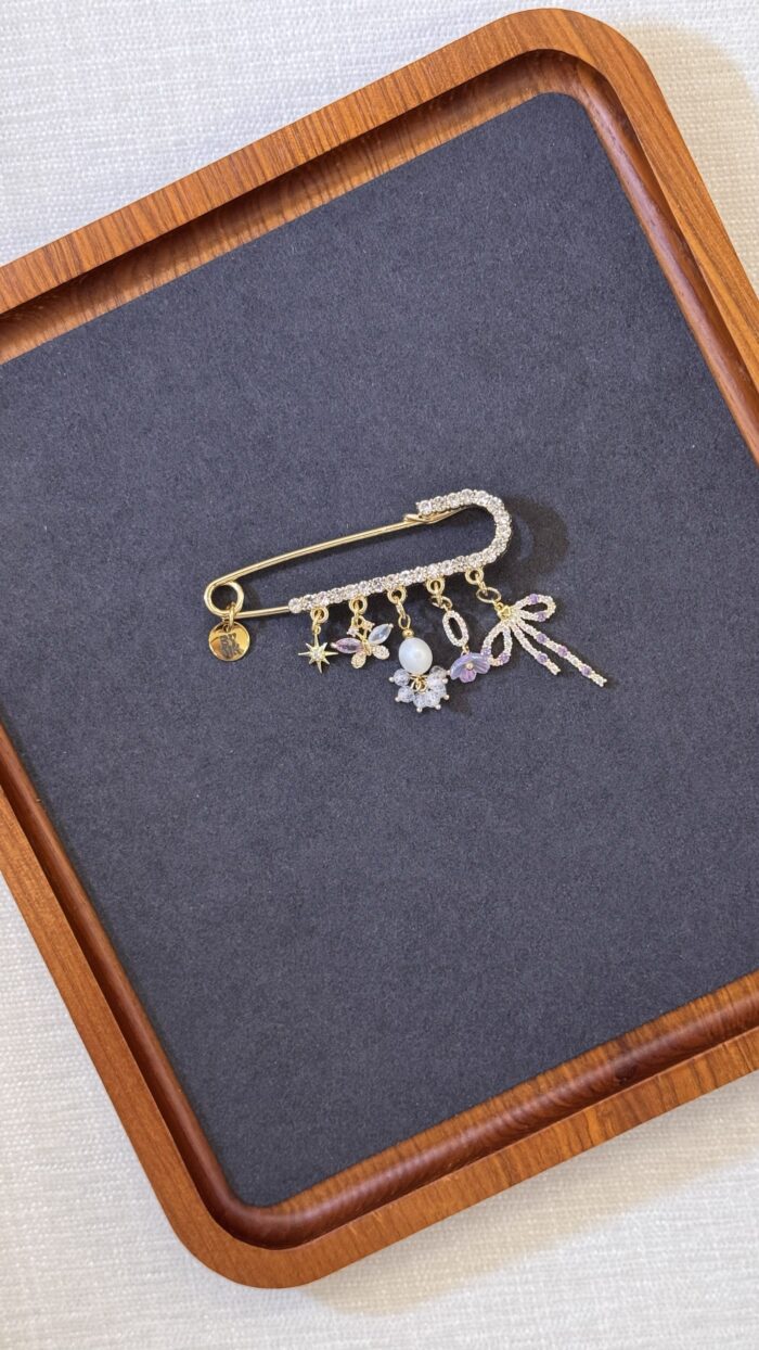 دبوس بتصميم كلاسيكي فاخر مرصّع بحبات الزركون البراقة، مرفق مع شارم مطلي ذهب عيار 18k ليضيف لمعة مميزة وفخامة استثنائية.