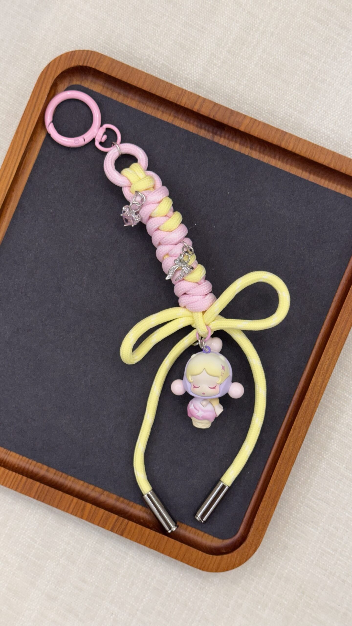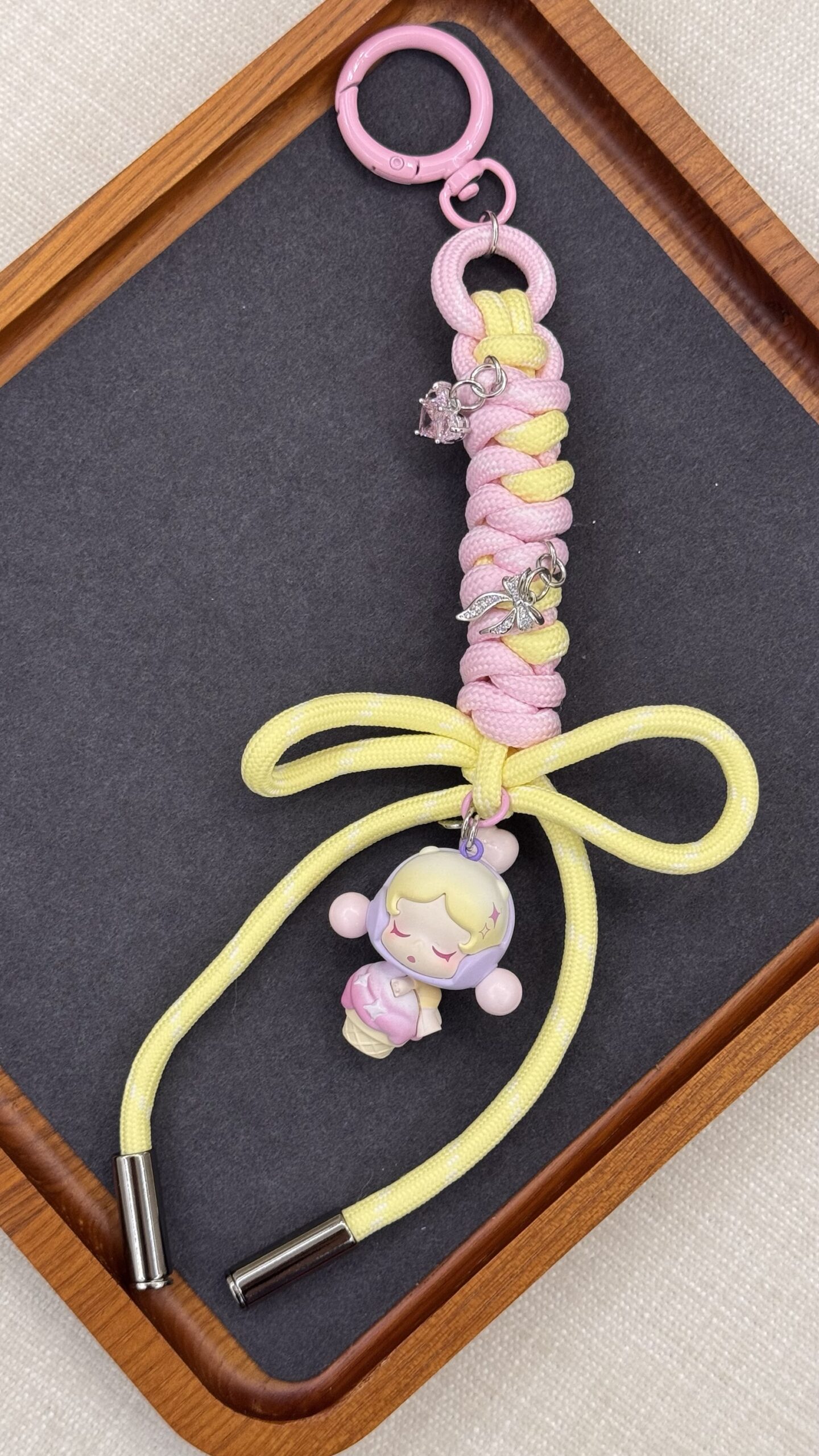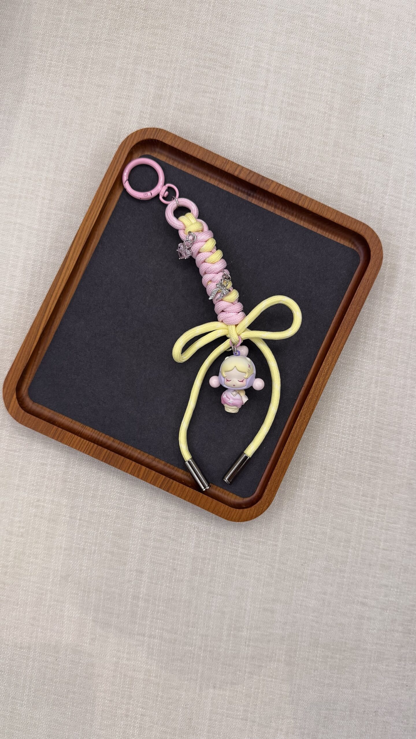 A handmade bag charm crafted from high-quality woven cords and adorned with elegant decorative accents. It features an original Pop Mart figure for an extra cute and unique touch.