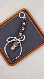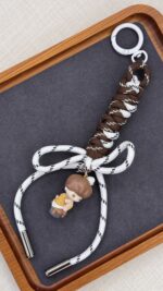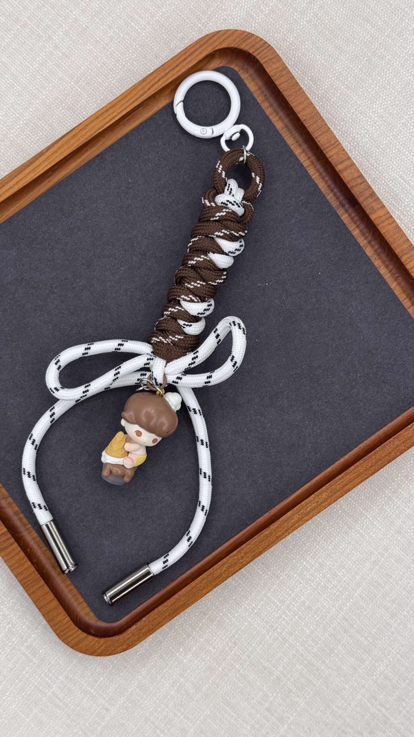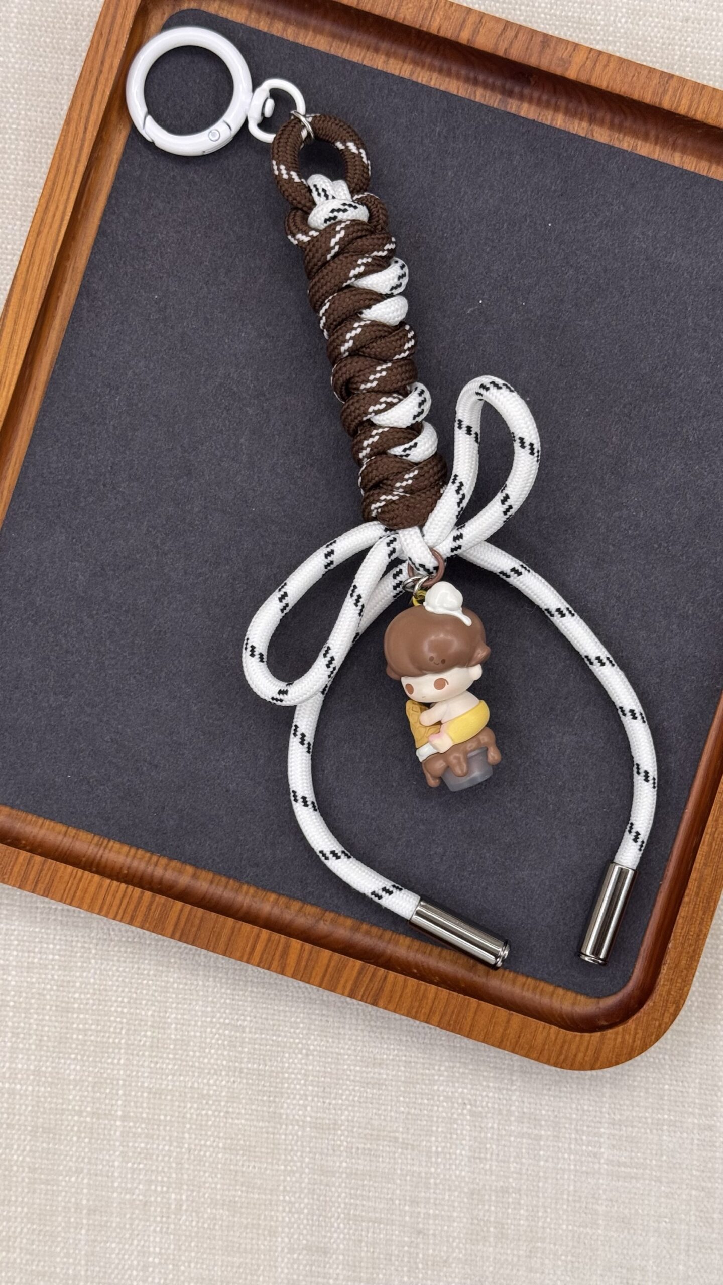 A handmade bag charm crafted from high-quality woven cords. It features an original Pop Mart figure for an extra cute and unique touch.